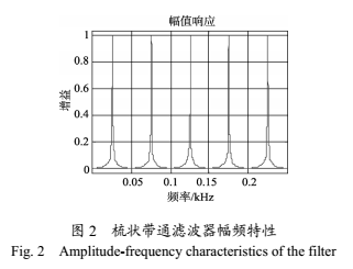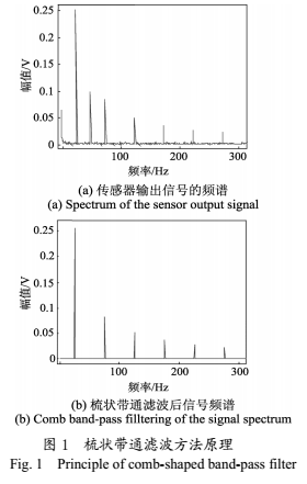 我們對(duì)采集到的實(shí)際傳感器輸出信號(hào)進(jìn)行頻譜分析后發(fā)現(xiàn)其頻譜范圍較寬,不僅含有明顯的基波和奇次諧波分量,在其他分量處也有值,如圖1(a)中所示的在0頻率分量處的直流漂移和50Hz頻率分量處的工頻干擾等。針對(duì)輸出信號(hào)的這種特點(diǎn),采用梳狀帶通濾波器,該濾波器能保留特定的頻率分量,而抑制其他的頻率分量。這樣,如圖1(a)所示的傳感器輸出信號(hào)經(jīng)過(guò)梳狀帶通濾波器后,有用的基波和奇次諧波分量將通過(guò)濾波器,而其他分量將被大幅度的抑制,濾波后的信號(hào)頻譜如圖1(b)所示,可以較大程度地抑制噪聲的影響。
