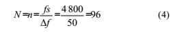 由頻譜特性可知,該濾波器相當(dāng)于多個(gè)通帶帶寬很窄的帶通濾波器的聯(lián)合,形狀上很像一把梳子。由式(2)可知,所要保留的基波和所有奇次諧波分量在0~fs范圍內(nèi)是均勻分布的。因此,所要求的帶通濾波器的個(gè)數(shù)n為fs除以需要保留的頻率點(diǎn)之間的間隔,即n=fs/△f。n必須為整數(shù),所以選擇的采樣頻率必須為間隔△f的整數(shù)倍。當(dāng)傳感器輸出信號(hào)為fo=25Hz,采樣頻率為4.8kHz時(shí),△f=2fo=50Hz。