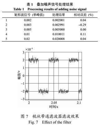 可見(jiàn),在模擬實(shí)際測(cè)量疊加噪聲的情況下,矩形波單峰值在0.002~0.02變化時(shí),處理結(jié)果的相對(duì)誤差在0.3%以?xún)?nèi)。由圖7并計(jì)算可知,經(jīng)過(guò)處理后的輸出信號(hào)的信噪比已由之前的-10.9dB提高到16dB。因此,該方法可以有效地抑制信號(hào)中的噪聲干擾,有助于提高處理結(jié)果的精度。