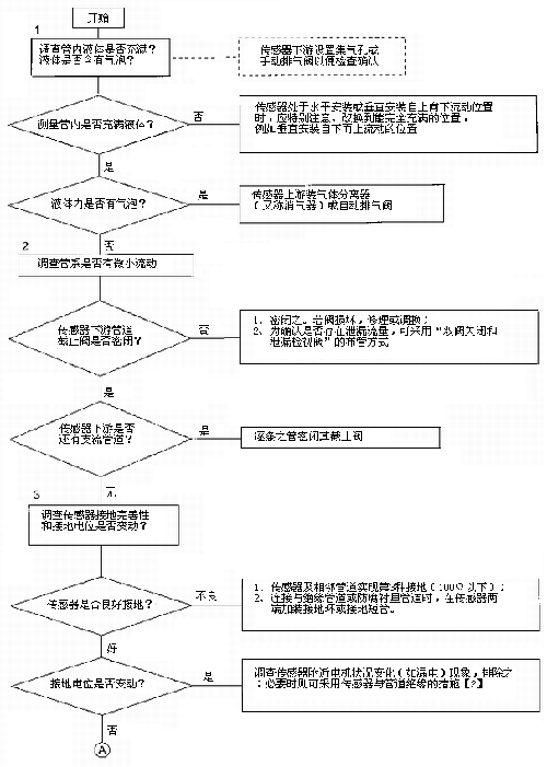 檢查流程圖*3項(xiàng)。管道雜散電流等外界干擾影響主要靠衛(wèi)生型卡箍式電磁流量計(jì)良好的接地保護(hù),通常要求接地電阻小于1000,不要和具他電機(jī)電器共用接地。有時(shí)候環(huán)境條件較好,衛(wèi)生型卡箍式電磁流量計(jì)不接地亦能正常工作,但是一旦良好環(huán)境不存在,儀表會(huì)出現(xiàn)故障,屆時(shí)再作檢查會(huì)帶來堵多麻煩。