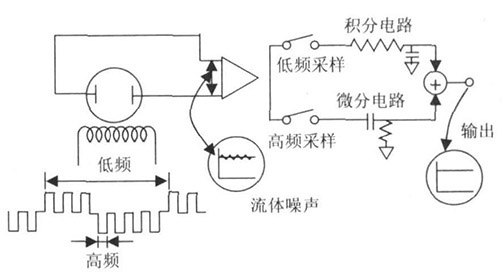 一個(gè)由高低頻分量迭加而成的電磁場(chǎng)通過勵(lì)磁線圈被施加到被測(cè)液體中, 勵(lì)磁波形是在一個(gè)低頻矩形波上迭加一個(gè)高于市電頻率的矩形波而得到的波形。在產(chǎn)生的電動(dòng)勢(shì)中, 低頻分量通過一個(gè)大時(shí)間常數(shù)的積分電路獲得一個(gè)零點(diǎn)穩(wěn)定性好的平穩(wěn)流量信號(hào)。而由漿液或低電導(dǎo)率流體產(chǎn)生的低頻噪聲可被不受噪聲影響的高頻采樣電路所抑制, 有著同樣時(shí)間常數(shù)的流量信號(hào)經(jīng)過一個(gè)差分電路以確定流速信號(hào)的變化, 把這兩種不同頻率采樣所得的信號(hào)結(jié)合起來可獲得一個(gè)穩(wěn)定流速信號(hào), 該信號(hào)不受噪聲干擾, 且有較高的零點(diǎn)穩(wěn)定性。