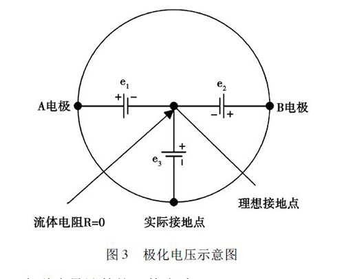 在被測液體與電*和接液部件接觸過程中,電解質中的正負離子會分別作定向運動,這會使被測液體在電*和接液部件之間形成電位差,通常將這種現象稱為*化現象。如圖3 所示,理論上來說,兩電*A 和B 對接液部件的電位e1、e2大小相等、方向相反,此時兩電*的電位差等于零。但是,若兩電*的材質或表面狀態(tài)存在差異,此時A、B 電*之間的電位差就不為零,這就形成了*化電壓,*化電壓與共模狀態(tài)的電壓e3一起疊加在流量信號中,被輸入轉換器的差動放大器。當*化電壓過大,則會對差動放大器的輸入端造成較大影響,導致信號無法放大或流量信號的輸出波動過大,從而降低了粘土漿流量計的測量精度。
