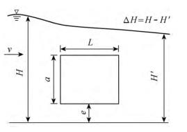 有限水域的浮體結(jié)構(gòu)在不同來(lái)流動(dòng)水中運(yùn)行時(shí),浮體結(jié)構(gòu)位置的改變會(huì)對(duì)流場(chǎng)產(chǎn)生影響,從而影響浮體結(jié)構(gòu)的泄流能力以及穩(wěn)定性。試驗(yàn)過(guò)程中固定浮體結(jié)構(gòu)的體型不變(長(zhǎng)L=0.20m,寬B=0.30m,高a=0.10m),分別選取4種不同來(lái)流流量Q及浮體結(jié)構(gòu)位置e,控制浮體結(jié)構(gòu)在上、下游水位不變的條件下進(jìn)行試驗(yàn),具體試驗(yàn)參數(shù)設(shè)計(jì)及說(shuō)明見表1以及圖2。