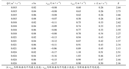 流速沿?cái)嗝娣植嫉木鶆蛱匦钥梢酝ㄟ^(guò)流速分布不均勻系數(shù)進(jìn)行表征,通過(guò)所選取斷面*大流速和*小流速的差值與該斷面平均流速的比值,δ值越大表明浮體結(jié)構(gòu)的存在對(duì)水流斷面流速的分布產(chǎn)生的影響較大。表2中,當(dāng)來(lái)流流量相同時(shí),流速的不均勻系數(shù)多數(shù)隨e的增大而減小。浮體結(jié)構(gòu)位置較小時(shí),主流為浮體結(jié)構(gòu)上部的水流。隨著浮體結(jié)構(gòu)位置的上升,來(lái)自上游的水體逐漸分成浮體結(jié)構(gòu)上部和下部的兩股主流,流速分布的不均性減小。浮體結(jié)構(gòu)位置及所處水位條件相同時(shí),來(lái)流流量的增大,區(qū)域的平均流速增大,因此流速不均勻性減小。