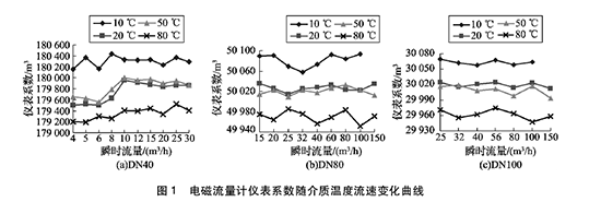 由圖1可得:( 1)隨著介質(zhì)溫度的升高,水泥計量表的儀表系數(shù)均呈逐漸降低的趨勢。其中20℃和50℃的儀表系數(shù)基本相同,10℃和80 0C的儀表系數(shù)與20℃時偏離較大。(2)溫度對水泥計量表的儀表系數(shù)在高溫以及低溫處影響明顯,以D N40水泥計量表為例,儀表系數(shù)本次實驗高低溫處*大變化量約為0. 7% o ( 3)在水泥計量表相應(yīng)的流量范圍內(nèi),在同一溫度下,隨著介質(zhì)流速的變化,水泥計量表的儀表系數(shù)在個別點出現(xiàn)略微浮動,但整體變化不超過1 0. 2 %。