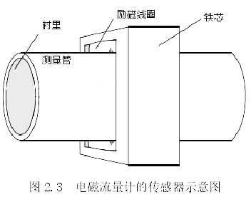 傳感器的主要作用是將通過(guò)管道的流量信號(hào)進(jìn)行轉(zhuǎn)換,將其轉(zhuǎn)為電動(dòng)勢(shì)。市面上常見的傳感器主要有下圖 2.4 中如測(cè)量管、鐵芯、勵(lì)磁線圈、襯里等結(jié)構(gòu)。