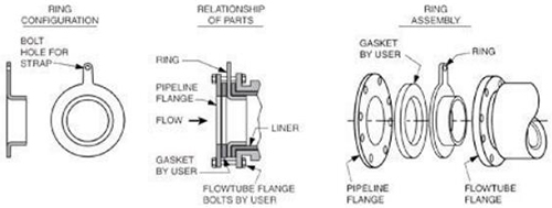 對于接地環(huán)應用,如果使用傳統(tǒng)的孔板式或C型接地環(huán),則必須使用接地帶將接地環(huán)連接到流量管的主體/外殼。這些帶子連接到流量管的法蘭上,或接地線連接到位于其遠程接線盒或頂部安裝的變送器接口板上的接線片上。E型接地環(huán)使用客戶提供的螺栓,而不是接地線或接地帶。