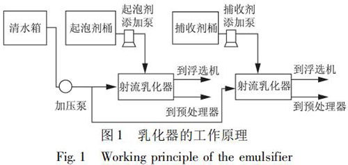 選煤廠浮選藥劑乳化裝置是將藥劑和水制成乳化液,實現(xiàn)藥劑的合理使用,將對浮選效果和節(jié)約藥劑起到一定的作用。在使用中可根據(jù)藥劑和水的配制比例觀察藥劑的乳化效果,通過乳化器操作箱內(nèi)的的電位器調(diào)整水泵轉(zhuǎn)速,即調(diào)整乳化壓力。自動加藥控制是根據(jù)入浮流量與入浮濃度的檢測結(jié)果,控制起泡劑與捕收劑的加入。乳化器的工作原理如圖 1 所示。