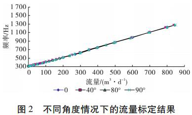 為了考察井眼斜度變化對dn500污水流量計測量流量的影響,開展了非集流dn500污水流量計在不同斜度情況下的流量測量模擬實驗。模擬實驗在大慶油田多相流實驗室進行,儀器外徑 38 mm,模擬井筒內(nèi)徑為 124 mm,實驗介質(zhì)是水,傾斜角度分別為 0°、40°、80°和 90°( 水平) ,流量范圍為 5 ~ 850 m3 /d。實驗結果表明,在儀器居中條件下,井眼斜度變化對dn500污水流量計的儀表常數(shù)沒有影響,滿量程誤差不大于 4% ,因此可以應用dn500污水流量計進行水平井注水剖面測量。不同角度情況下的實驗結果如圖 2 所示。