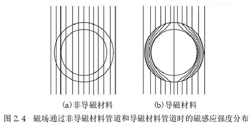 1.測量管:主要是傳感器的管道,該管道由高導(dǎo)電率非導(dǎo)磁材料制成,可保證流體在通過時能夠表現(xiàn)出自身的電磁效應(yīng),在該管道內(nèi)中安裝了內(nèi)襯。使用非導(dǎo)磁材料的原因是保證勵磁線圈中所產(chǎn)生的磁場不會順著管道流走,確保測量管道內(nèi)部產(chǎn)生明顯的磁感應(yīng)線,下圖 2.4 中展示了利用非導(dǎo)磁材料和導(dǎo)磁材料管道中所產(chǎn)生磁感應(yīng)線的情況。