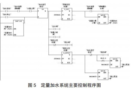 定量加水系統(tǒng)的工作過程為:當(dāng)設(shè)定好加水量后,啟動系統(tǒng),多級離心泵 10、回流閥 4、出水閥 9 和流量計前閥 12開啟對管路進(jìn)行預(yù)填充;延時 30s 預(yù)填充完成后,回流閥 4關(guān)閉,調(diào)制罐補(bǔ)水閥 14 開啟,同時質(zhì)量流量計 13 開始計量;當(dāng)質(zhì)量流量計的累積量與設(shè)定加水量一致時,出水閥 9 和調(diào)制罐補(bǔ)水閥 14 關(guān)閉;調(diào)制罐定量加水完成后,開啟回收閥17 和回流閥 4 以及同未關(guān)閉流量計前閥 12 一起,利用壓縮空氣對管道中水實現(xiàn)回收;延時 30s 水回收完成后,關(guān)閉多級離心泵、球閥 4、12 和 17,定量加水過程完成。定量加水系統(tǒng)主要控制程序如圖 5 所示。