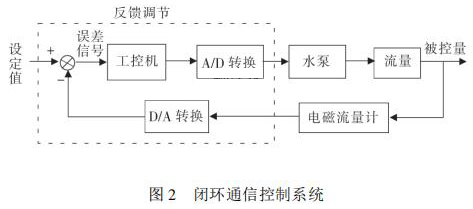 通信控制系統(tǒng)由工控機、變頻器、水泵、數(shù)據(jù)采集卡、熱水流量計等組成。在整個熱量表耐久性試驗裝置中,熱水流量計與被試驗熱量表串聯(lián)在試驗管路中。系統(tǒng)設(shè)定流量值 qs,通過工控機發(fā)送信號給變頻器,來控制水泵運轉(zhuǎn),系統(tǒng)通過研華數(shù)據(jù)采集卡 PCI1711 將采集到的熱水流量計當(dāng)前瞬時流量值反饋給工控機,工控機將返回流量值與設(shè)定流量值qs進(jìn)行比較,從而確定是否需要重新調(diào)整變頻器頻率控制水泵轉(zhuǎn)速。此過程是一個完整的閉環(huán) PID 控制過程,其閉環(huán)控制過程如圖 2 所示。 2. 2 管路切換系統(tǒng)管路切換主要由冷熱水箱、水泵、開關(guān)閥等組成。要實現(xiàn)熱量表耐久性 4000 次冷熱沖擊試驗,需要實時控制管路中熱水與冷水的交替使用。