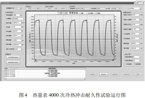本文研究的 4000 次冷熱沖擊試驗的實現(xiàn)具有以下特點: (1)基于“工控機 +水泵 + 熱水流量計”的閉環(huán)控制系統(tǒng),實現(xiàn)了流量自動反饋調(diào)節(jié),滿足試驗要求; (2)通過四個開關(guān)閥的時序切換,自動控制試驗溫度,很好的完成了 4000 次溫度沖擊試驗; (3)通過“工控機 + 數(shù)據(jù)數(shù)據(jù)采集卡”的數(shù)據(jù)采集系統(tǒng),實時監(jiān)控試驗過程中的流量、溫度、壓力等相關(guān)參數(shù),實現(xiàn)試驗方式的自動控制,并能對試驗數(shù)據(jù)進(jìn)行分析與評定。 (4)試驗的全過程為智能自動化,可無人員留守看護(hù)。試驗結(jié)果可直接反映出熱量表在長時間運行后的可靠性。為我國熱量表耐久性試驗研究提供檢測手段,為促進(jìn)產(chǎn)品質(zhì)量提升做好技術(shù)保障。