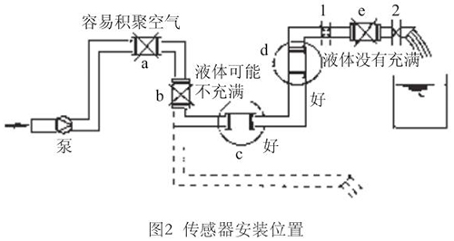 液體流動方向必須與傳感器殼體上箭頭方向一致。對于能正反向測量的廢水流量表,若方向不一致雖仍可測量,但設(shè)定的顯示流動正反方向不符,必須改正之。若拆傳感器工作量大,也可改變傳感器上箭頭方向和重新設(shè)定顯示儀表符號。管道未充滿液體主要是管網(wǎng)工程設(shè)計或傳感器安裝位置不妥,使傳感器測量管內(nèi)不能充滿液體。應(yīng)采取措施,避免安裝如圖2所示a,e位置和以虛線管排放時b位置,改裝到c,d位置。