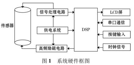 高頻勵(lì)磁電鍍廢水流量表由傳感器、高頻勵(lì)磁電路、信號(hào)處理電路等組成,其中高頻勵(lì)磁電路決定著傳感器磁場的強(qiáng)弱,勵(lì)磁電路的穩(wěn)定性以及精確性決定著系統(tǒng)檢測的準(zhǔn)確性以及穩(wěn)定性。DSP 系統(tǒng)控制勵(lì)磁電路激勵(lì)傳感器線圈,當(dāng)線圈中有導(dǎo)電液體流過時(shí),其切割磁感線并在傳感器兩端的線圈上產(chǎn)生感應(yīng)電動(dòng)勢,利用信號(hào)檢測電路監(jiān)測感應(yīng)電動(dòng)勢的大小,*后根據(jù)相應(yīng)關(guān)系計(jì)算出液體的流量,系統(tǒng)硬件框圖如圖 1 所示。