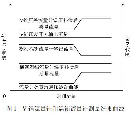 根據(jù)物料平衡反復(fù)研究,渦街流量計(jì)測量的質(zhì)量流量動態(tài)曲線比較客觀反映了蒸汽流量的變化; 而 V 錐流量計(jì)測量的質(zhì)量流量偏大 5%。說明該差壓流量計(jì)元件沒能產(chǎn)生和實(shí)際流量變化對應(yīng)的差壓。