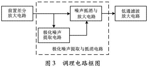根據(jù)前饋控制的自適應(yīng)*化噪聲抵消原理,設(shè)計了信號調(diào)理電路2,以實(shí)現(xiàn)*化噪聲的濾除。信號調(diào)理電路2主要包括前置差分放大電路、*化噪聲提取與抵消電路、低通濾波放大電路三部分。調(diào)理電路如圖3所示。