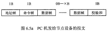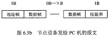 在紙漿流量計等節(jié)點設備和C機通信的過程中,由地址幀、命令幀、數(shù)據(jù)幀、校驗和可組成各種功能不同的報文。由于采用主從工作方式來實現(xiàn)通信,紙漿流量計等節(jié)點設備僅能接收并執(zhí)行PC機發(fā)送來的控制命令,而不能發(fā)送命令給PC機。因此,由PC機發(fā)往流量計等節(jié)點設備的報文一般包括一個地址幀,一個命令幀,若干個數(shù)據(jù)幀和一個校驗和,其報文格式圖.6a5所示;而由流量計等節(jié)點設備發(fā)往PC機的報文一般包括一個地址幀,若干個數(shù)據(jù)幀和一個校驗和,其報文格式如圖6.5b所示。