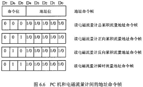 由于RS一485電氣標準規(guī)定每段只能聯(lián)結犯個節(jié)點設備,因此可用地址幀中五個二進制位表示這32個地址,其余3位用來表示命令,從而構成地址命令幀。對于控制命令需求不超過八個的通信系統(tǒng),采用地址命令幀可壓縮報文長度提高通信效率。在污水網(wǎng)絡監(jiān)控系統(tǒng)中,紙漿流量計和PC機通信的主要目的是將流量計中的有用數(shù)據(jù)讀到PC機中。這些數(shù)據(jù)包括:總累積流量、正向累積流量、反向累積流量、瞬時流量。通信時,PC機只需向紙漿流量計發(fā)送讀總累積流量、讀正向累積流量、讀反向累積流量、讀瞬時流量命令即可,因此二者間通信所用的地址幀和命令幀可合二為一,用一個地址命令幀代替。PC機和紙漿流量計間的地址命令幀定義如圖.66所示。根據(jù)污水網(wǎng)絡監(jiān)控系統(tǒng)中PC機與紙漿流量計間通信的特殊性,二者通信所使用的報文可簡化為圖.67的格式。