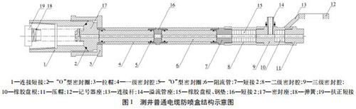 注入剖面測試中,溢流量對測量結果影響至關重要。如圖 1 所示,測井普通防噴盒采用 3 級密封: * 1 級密封為阻流管( 6) ,測 20 井次左右阻流管內徑變大,溢流量增加; * 2 級為橡膠盤根和鋼墊( 15) ; * 3 級為橡膠盤根( 10) ,調整壓帽( 11) 松緊程度,橡膠盤根抱緊電纜; * 2 級和* 3 級密封更換一次橡膠盤根測試 3 ~ 5 井次溢流量增加。普通防噴盒無法實現(xiàn)溢流量,沒有捕捉器、防噴器和放噴組裝件。普通電纜防噴裝置工作壓力20 MPa,耐壓 40 MPa。