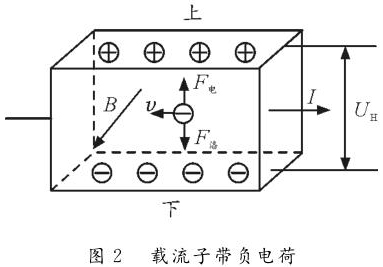 反之,如圖2所示,若載流子帶負(fù)電荷,則載流子在洛倫茲力作用下會向下偏轉(zhuǎn),導(dǎo)體下表面積累負(fù)電荷。同時,上表面失去負(fù)電荷而帶上正電,從而使上表面電勢高于下表面。