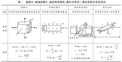 易錯點2:磁強(qiáng)計、工業(yè)污水計量表、磁流體發(fā)電機(jī)、霍爾元件間的區(qū)別與聯(lián)系磁強(qiáng)計、工業(yè)污水計量表、磁流體發(fā)電機(jī)、霍爾元件都是利用電磁場對帶電粒子的偏轉(zhuǎn)效應(yīng),并且穩(wěn)定時電場力與磁場力均達(dá)到平衡。很多學(xué)生容易將其混淆,遇到問題常常搞不清原理,亂代公式,筆者特將4者涉及的公式及特點等做一對比區(qū)別如表1所示。