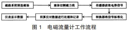 煤礦污水計(jì)量表的產(chǎn)生主要是基于法拉*電磁感應(yīng)定律。在煤礦污水計(jì)量表的應(yīng)用中,磁路系統(tǒng)會(huì)在流量計(jì)運(yùn)行過程中逐步出現(xiàn)直流磁場與交流磁場,該磁場的產(chǎn)生為后期的測量提供了良好的前提條件,營造了測量所需的磁場環(huán)境,因此,在煤礦污水計(jì)量表應(yīng)用時(shí),一旦被測液體在導(dǎo)管中經(jīng)過該磁場環(huán)境時(shí),必然會(huì)產(chǎn)生一定的切割磁力線運(yùn)動(dòng),在這種情況下,電*傳感器就會(huì)發(fā)揮其作用,將導(dǎo)管內(nèi)的流量轉(zhuǎn)換為感應(yīng)電勢(shì)信號(hào),隨后此轉(zhuǎn)換形成的信號(hào)逐步被傳遞給轉(zhuǎn)換器。而轉(zhuǎn)換器更是可以將所獲得的流量信號(hào)等加以處理,通過分析、對(duì)比等,轉(zhuǎn)換器會(huì)將該信號(hào)變?yōu)闃?biāo)準(zhǔn)信號(hào),隨后將該信號(hào)輸出給積算儀,進(jìn)一步進(jìn)行信號(hào)的處理,這些處理以后的信號(hào)*終會(huì)在煤礦污水計(jì)量表的儀表中顯示,呈現(xiàn)*終的流量測量結(jié)果,其基本的流程如圖 1 所示。