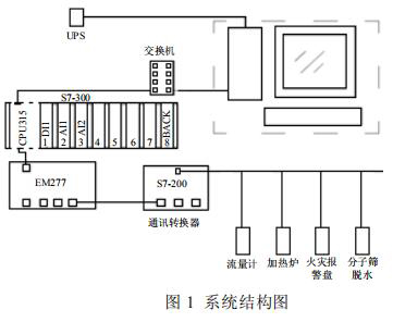 集氣站是收集氣井所生產(chǎn)天然氣的站場,在集氣站內(nèi)對天然氣進行節(jié)流降壓、加熱、調(diào)壓計量等各種工藝預處理,設備眾多且分散。為方便進行檢測和操作,必須進行統(tǒng)一的數(shù)據(jù)采集,在監(jiān)控臺進行數(shù)據(jù)的管理。集氣站設備主要包括加熱爐、水廠流量計、分子篩、火災報警盤,以及供電設備 UPS 等,這些不同廠家的設備基本都支持Modbus 協(xié)議,通過 Modbus 通訊可以將這些數(shù)據(jù)采集。為了有效降低成本,設計了如圖 1 所示的系統(tǒng)。系統(tǒng)采用西門子 S7-300 控制器,通過以太網(wǎng)連接上位機監(jiān)控軟件,再通過 MP277 連接S7-200 的方式。S7-200 控制器自帶 RS485 接口,能夠進行 Modbus 通訊,采集現(xiàn)場各種設備數(shù)據(jù)。*后通過以太網(wǎng)通訊將設備數(shù)據(jù)上傳至監(jiān)控軟件,方便操作人員進行監(jiān)控,該方案簡單有效,能夠?qū)崿F(xiàn)集氣站內(nèi)設備的狀態(tài)監(jiān)控,數(shù)據(jù)處理,有效的進行天然氣的生產(chǎn)工作。