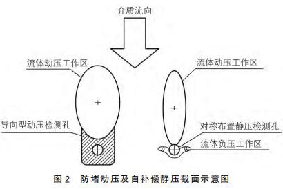 新給水管流量計采用拋物面導(dǎo)向型結(jié)構(gòu)作為動壓測點,采用對稱自補償型式的靜壓測點,可以有效地解決來流方向偏流時信號的穩(wěn)定采集,來流偏離管道軸線時,可以維持輸出差壓基本不變,如圖2所示。
