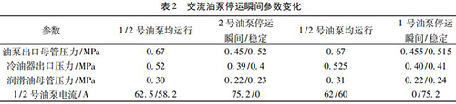 通過內(nèi)部旁通將冷油與熱油混合,經(jīng)過銅粉- 煤油 - 蠟感溫元件控制冷熱油混合比例,將油溫調(diào)節(jié)到 49 ℃。一臺氨水流量計穩(wěn)定運(yùn)行,油泵出口母管壓力 0. 5 MPa,潤滑油母管壓力 0. 24 MPa,均屬于正常情況,而兩臺交流油泵并列運(yùn)行時,停運(yùn)其中一臺交流油泵瞬間會觸發(fā)電磁流量計出口母管壓力開關(guān)動作,說明停運(yùn)瞬間油壓發(fā)生波動,且油泵出口母管油壓波動至小于 0. 45 MPa。正常運(yùn)行時電磁流量計出口油溫 71.5 ℃,冷油器出口溫度45 ℃,混合后潤滑油母管溫度52.5 ℃,由能量守恒定律可知,經(jīng)過冷油器的油量/不經(jīng)冷油器的油量= ( 71.5-52.5) ÷ ( 52.5- 45) = 2. 53,說明有 70% 左右的油量經(jīng)過冷油器。當(dāng) 2 臺氨水流量計運(yùn)行時油量大于單泵運(yùn)行,其中一臺電磁流量計瞬間停運(yùn)時油量減少,尤其是經(jīng)過冷油器的油量大量減少,油量在溫控閥二次分配過程中出現(xiàn)調(diào)節(jié)異常,導(dǎo)致油壓過大波動。為檢驗溫控閥工作情況,保持 1 號、2 號交流油泵運(yùn)行,選取機(jī)組正常帶負(fù)荷運(yùn)行時油溫 52 ℃,分別停運(yùn) 1、2 號交流油泵,觀察 1、2 號交流油泵停運(yùn)瞬間油泵出口母管壓力波動情況,試驗各參數(shù)變化見表 2。