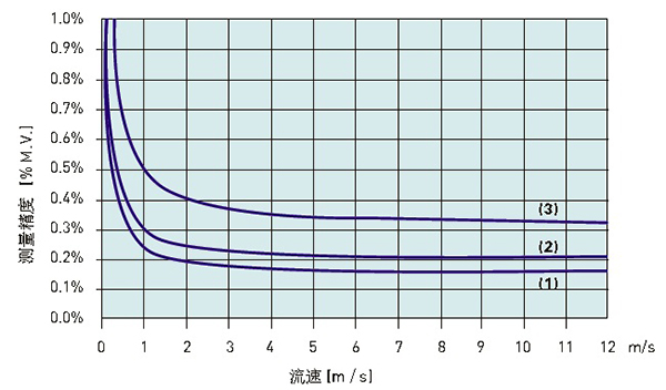 原水流量計(jì)實(shí)質(zhì)是測(cè)量介質(zhì)的流速,它是速度式流量計(jì)。一般原水流量計(jì)推薦流速在0.3m/s-5m/s,在這個(gè)范圍內(nèi),流量計(jì)測(cè)量精度高、線性好、水力損耗小、介質(zhì)對(duì)流量計(jì)傳感器襯里和電*的磨損也較小。以某品*原水流量計(jì)選型樣本提供的流速曲線為例(見圖3),可以看出流量越小、流速越慢,測(cè)量誤差越大,曲線在0.3m/s處存在拐點(diǎn)。
