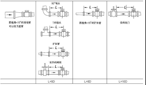 得出圖3的流速曲線有一個(gè)前提條件,就是保證流量計(jì)前后直管段的要求。為了使流過傳感器介質(zhì)流態(tài)穩(wěn)定,測(cè)量精度不受流速分布影響,通常對(duì)流量計(jì)直管段長(zhǎng)度要求上游10D、下游5D(D為原水流量計(jì)口徑),如圖4所示。直管段是從原水流量計(jì)傳感器中點(diǎn)算起,并是不很多人以為的法蘭連接處算起。