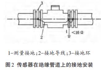 傳感器安裝在塑料管道或內(nèi)壁有絕緣涂層、襯里的管道上,兩端應(yīng)安裝接地環(huán)(或帶有接地電*的金屬短管),然后用導(dǎo)線連接,使管內(nèi)流動(dòng)的介質(zhì)與大地短路,具有零電位(見(jiàn)圖2)。