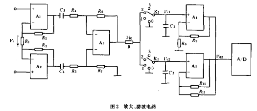 從圖2中可以看出,由Al,A2,A3。所組成的放大電路為一個典型的高輸入阻抗的雙端輸入、單端輸出的交流放大電路。由A4,A5所組成的放大電路為一個高輸入阻抗的雙端輸入、單端輸出的直流放大電路。K1,K2采用模擬開關CD4052。這是一個雙路四通道的模擬開關。電路中的兩個開關是同步的。R是濾波電阻,C1,C2是兩只容量相同的濾波電容。
