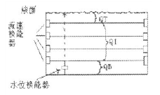 由(3)式可見,只要測出正逆向的傳播時間T1、T2就可以計(jì)算出水的流速,進(jìn)而求得流量。但是根據(jù)(3)式求得的流速是超聲波傳播路徑上的線平均流速,由于在一個渠道的水流斷面上,各處的流速并不相同,因此僅用一個聲路計(jì)算流量將會產(chǎn)生很大的誤差。為提高測量精度,我們在明渠斷面的不同高度上設(shè)置了四路換能器下圖,構(gòu)成多個測量聲路,從而測出水流斷面上的多層流速。同時還設(shè)一個水位換能器,這樣流量計(jì)中的計(jì)算機(jī)可以根據(jù)測得的流速和水位準(zhǔn)確地計(jì)算出流量Q。為了及時了解流量計(jì)的運(yùn)行情況和檢測數(shù)據(jù),通過RS232數(shù)據(jù)接口和RS485接口,將數(shù)據(jù)傳給“893”網(wǎng),供調(diào)度系統(tǒng)和相關(guān)部門使用。
